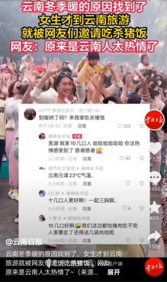 杭州游客才到云南旅游,就收到了无数云南人的邀请。“快来我家吃杀猪饭”“到了版纳别忘了来我们寨子吃肉”……女孩留言称,云南人就像这里的天气一样温暖。
