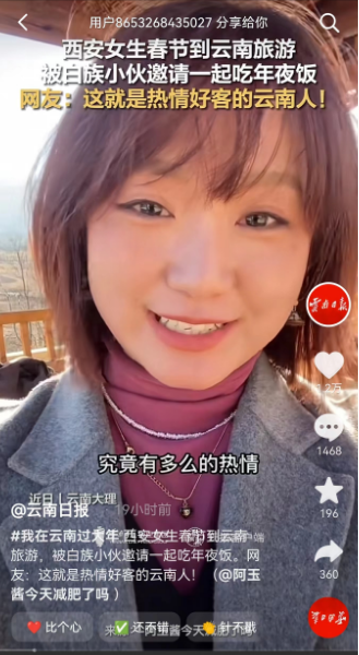 西安两位女生春节到云南大理旅游,被白族小伙邀请一起吃年夜饭,小伙一直对她们重复说道:“那你们可不能给钱,我们不收费。”最后两位女生没有花一分钱就吃到了年夜饭,尝到了真正的本地味道,和本地人度过了一个最特别的春节。西安女生表示,云南让我依然相信着人与人之间的信任和真诚,如果有机会一定要来云南,和本地人一起玩一玩。
