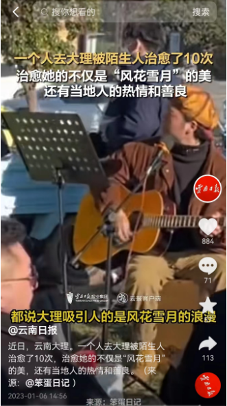一位特别钟爱云南的网友近日发布视频称,自己在大理旅游,被治愈了10次。旅途中,有餐馆老板送上的美食,有当地人热情的邀请,她表示这份感动不仅来自“风花雪月”,还有当地人的热情和善良。