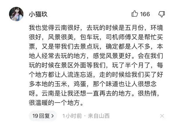 山西网友“小猫玖”留言:“我也觉得云南很好,去玩的时候是五月份,环境很好,风景很美,包车玩。走的时候司机师傅给我们买了好多本地的玉米,鸡蛋,那个味道也让人很想念呀。云南是让我还想一直再去的地方。很热情,很温暖的一个地方。”