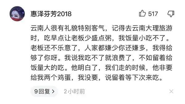 网友“惠泽芬芳2018”留言称,云南人很有礼貌特别客气,“记得去云南大理旅游时,吃早点老板非要给我两个鸡蛋,我没要,说留着等下次来吃。”