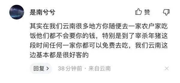 云南网友“是南兮兮”留言表示,其实在我们云南很多地方你随便去一家农户家吃饭他们都不会要你的钱,特别是到了宰杀年猪这段时间任何一家你都可以免费去吃,我们云南这边基本都是很好客的。