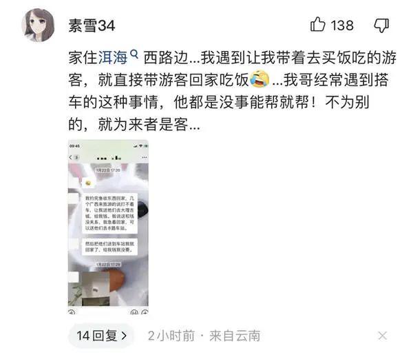 来自大理的网友“素雪34”留言:“家住洱海西路边……我遇到让我带着去买饭吃的游客,就直接带游客回家吃饭......我哥经常遇到搭车的这种事情,他都是没事能帮就帮!不为别的,就为来者是客…...”