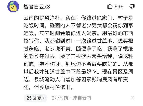 “云南的民风淳朴,实在!一次路过甘蔗地,想买根甘蔗吃,老乡说不卖,随便拿了吃,我拿了根细的老乡夺过去,捡了二根砍去两头给我,说这种好吃,泡不伤牙。从那以后我才知道甘蔗中下段最好吃。”网友“智者白云x3”留言说。