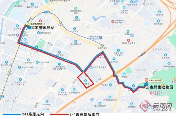 调整后,241路起终站、运营时间、票制票价不变,行驶路线去程(开往云南野生动物园方向)按原线行驶至司家营街,经司家营街、严家山路、金沣街、丰江路、司家营街、严家山路回原线行驶,往返复行。