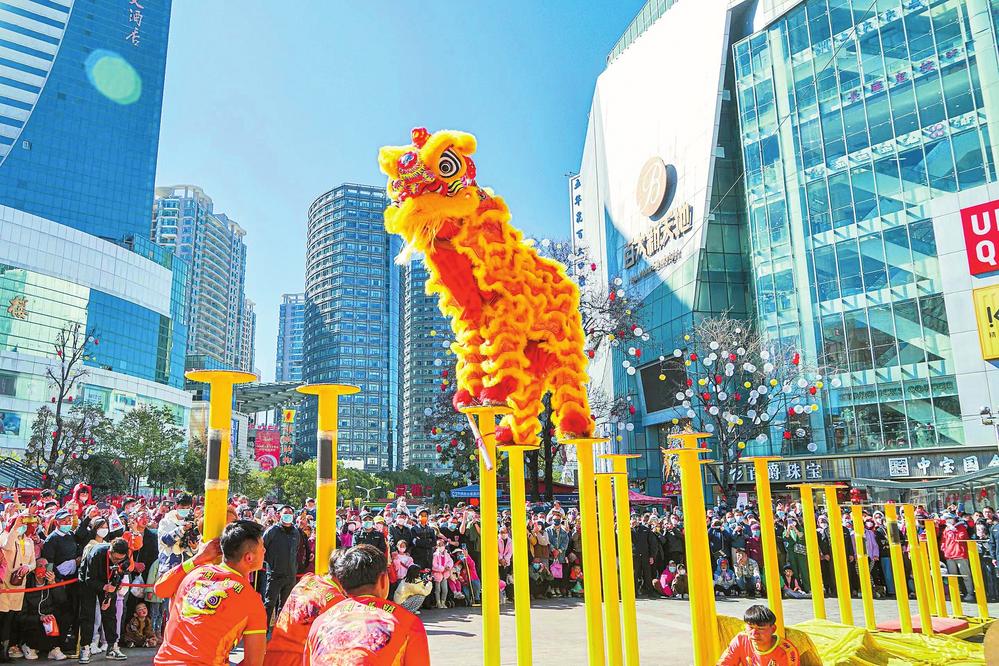 大年初一,南屏街锣鼓齐鸣,龙狮闹春。