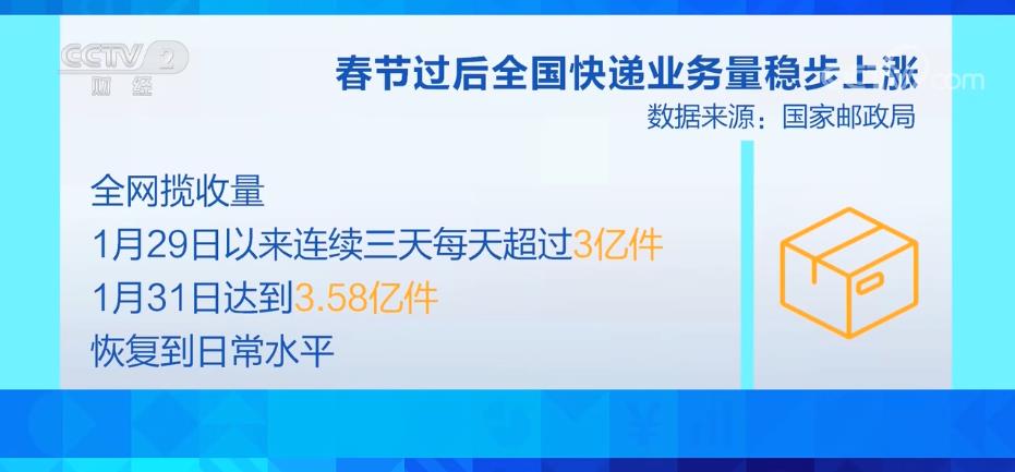 国家邮政局监测数据显示,春节过后,全国快递业务量稳步上涨,自1月29日以来连续三天每天超过3亿件。1月31日全网揽收量达到3.58亿件,恢复到日常水平。