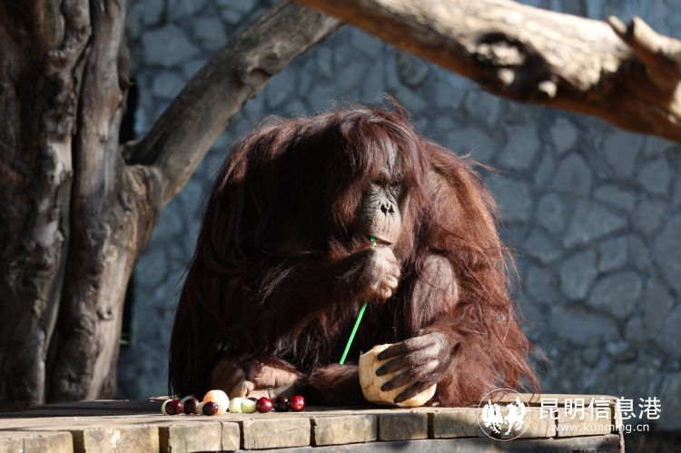 云南野生动物园的红毛猩猩“二毛”,是珍稀区一个开朗调皮的“小公主”。现场,工作人员为它准备了“椰子元宵”,提前在椰子顶部开了一个小孔,还贴心地放上了吸管,只见二毛拿起椰子就熟练地用吸管喝了起来。