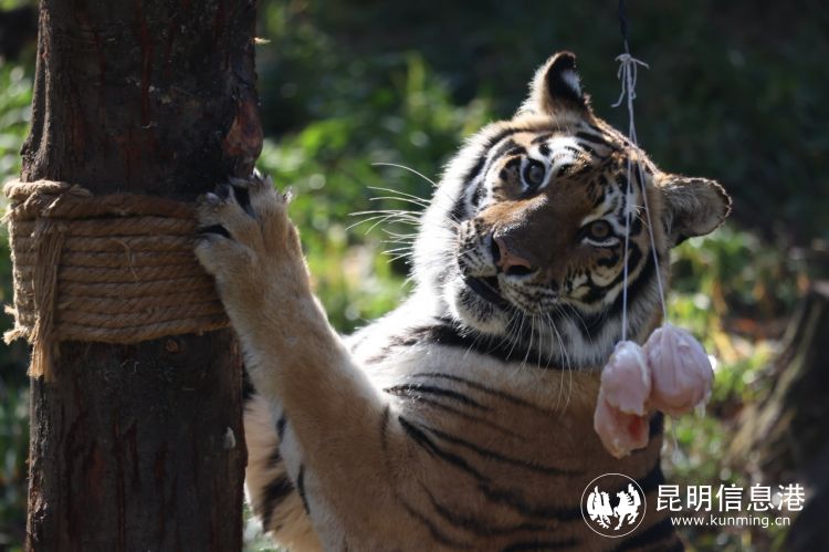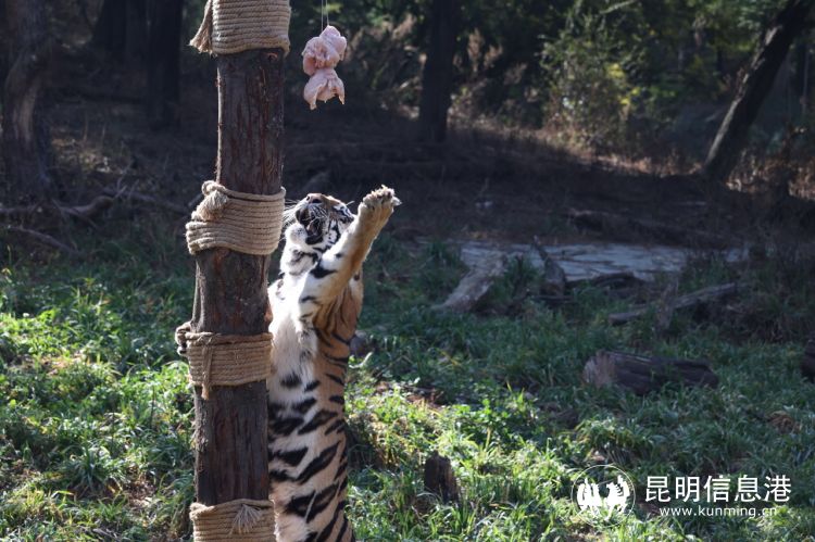 此外,鸟中大力士——鹦鹉,园区为他们准备了“核桃元宵”,它们强有力的喙,能啄开坚硬的果实外皮。东北虎收到的则是由鸡胸肉组成的大肉球元宵。为了增强他们运动量,保育员把“肉球元宵”吊在了树上,增加采食过程中的运动量,让它们在享用美食的同时也能保持健康的体魄。