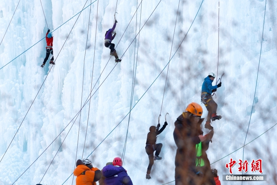 攀冰爱好者在北京密云区云蒙峡风景区攀冰场感受冰雪运动快乐。