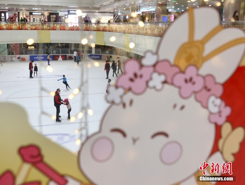兔年春节将至,市民在北京一商场室内滑冰场滑冰休闲,乐享冰雪运动。