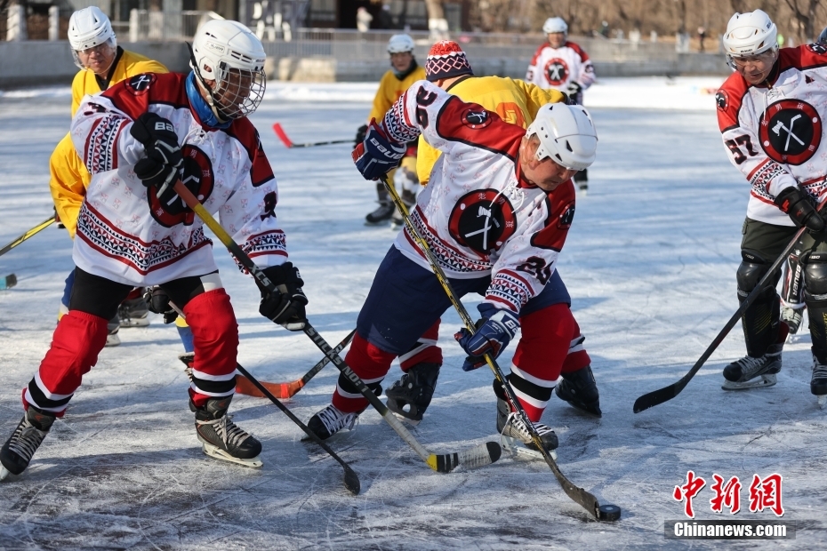 沈阳市铁西区劳动公园的冰面上,“老男孩”冰球队激战正酣。这是一支由平均年龄达到65岁的老年人组成的业余冰球队。