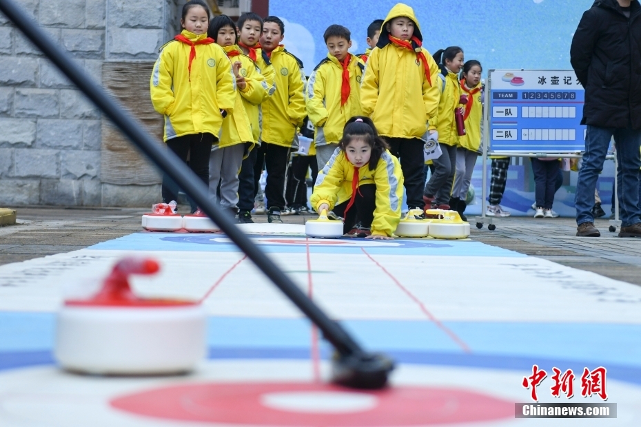 湖南长沙清水塘江湾小学举行开学第一课活动,为学生们进行旱地冰壶教学,推广冰雪运动。