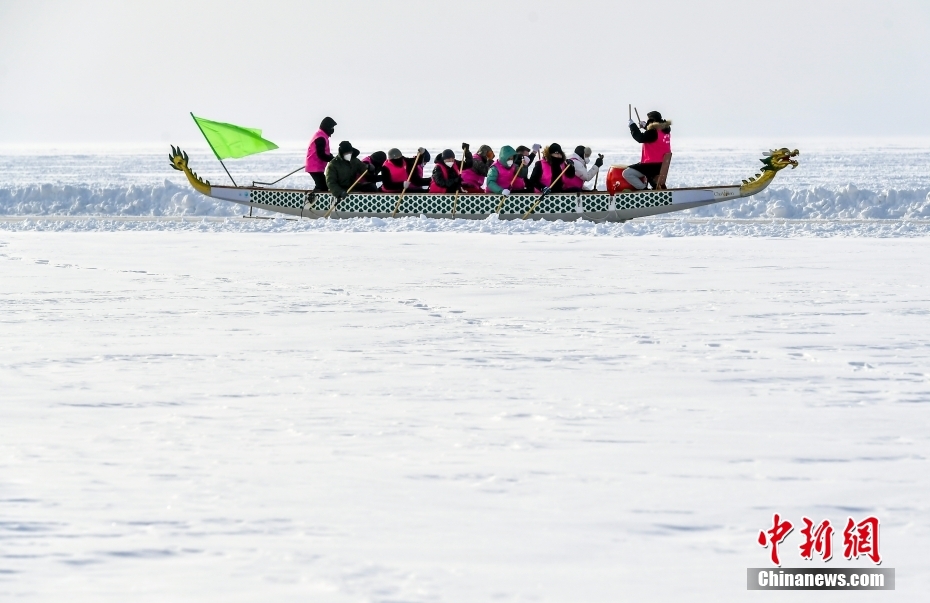 新疆阿勒泰地区福海县,一场冰上龙舟比赛在乌伦古湖冰面上举行。被积雪覆盖的冰面上,工作人员清理出400米圆形赛道,各参赛队在冰面上展开追逐。