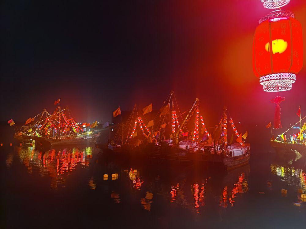 渔灯节期间,渔船上挂满红灯笼,弥漫着喜庆祥和的气氛。(新华社记者张武岳 摄)