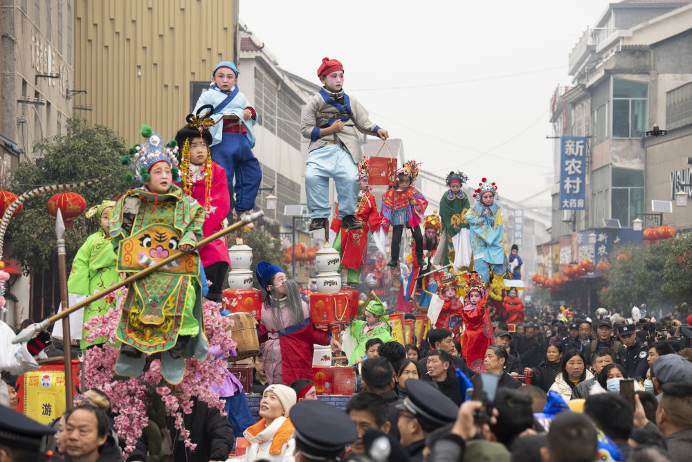 精美的脸谱、五彩的戏服、古典的造型,还有高跷演员踩着5米的高跷,一步一摇,或俯或仰之间,走出惊险刺激的感觉。近300台“故事”逐一亮相,叫好声、惊叹声飘荡在古镇的上空。