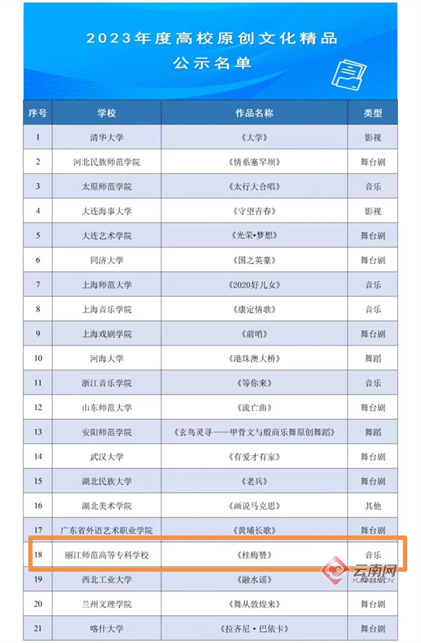 近日,教育部思想政治工作司发布了《关于2023年度高校思想政治工作质量提升综合改革与精品建设项目遴选结果的公示》,丽江师范高等专科学校报送的原创民族歌剧《桂梅赞》拟入选“2023年度高校原创文化精品”。
