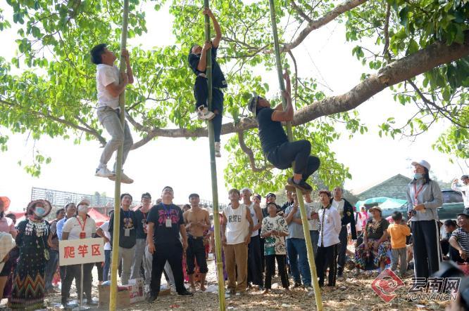 舞场内洋溢着热情奔放的节日气氛,充满了欢歌笑语。舞场旁,社区运动会——大美陇川2023年陇川县第三十九届朋生目瑙纵歌节民族传统体育体验活动成为目瑙场的一大亮点,体验区域内,好看又好玩的民族传统体育体验吸引了不少游客驻足,来自国内外的游客可以在这里尽情体验到景颇族多姿多彩的民族体育文化:爬杆、抵棍、扭棍、篾弹弓……在工作人员的讲解及示范下,跃跃欲试的朋友可不少呢!