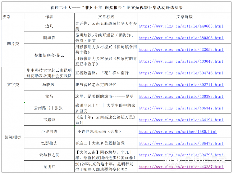 昆明信息港讯 由昆明市委网信办指导,昆明信息港彩龙社区主办的喜迎二十大——“非凡十年 向党报告”图文短视频征集活动,旨在多角度展现云南省十年来的跨越式发展和巨大历史性成就,营造喜迎党的二十大的良好氛围。经评选,最终12组投稿作品脱颖而出,获得本次活动优秀奖。