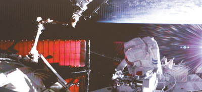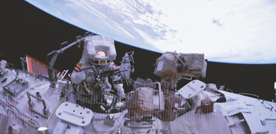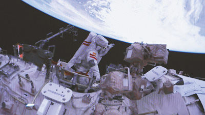通过北京飞控中心指挥大厅屏幕显示的实时画面,可以清晰地看到,身着带有红色标识“飞天”航天服的神舟十五号乘组01航天员费俊龙抓住环形扶手,“跃”出问天实验舱的气闸舱,完成神舟十五号航天员乘组出舱首秀,他身后是深邃的宇宙和蔚蓝色的地球。指挥大厅现场顿时响起热烈掌声。随后,根据任务安排,身着带有蓝色标识“飞天”航天服的03航天员张陆也顺利出舱。根据任务分工,02航天员邓清明留在舱内协助配合。