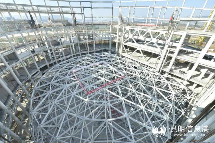 昆明信息港讯 记者周智宇 2月10日,昆明空港文化广场秀场中部演艺厅网架屋面结构完成提升高度32.98米,标志该项目15000吨主体钢结构全面完工,为昆明空港文化广场项目在今年12月31日实现竣工验收奠定了扎实的基础。