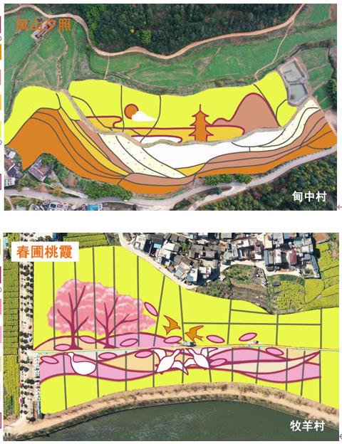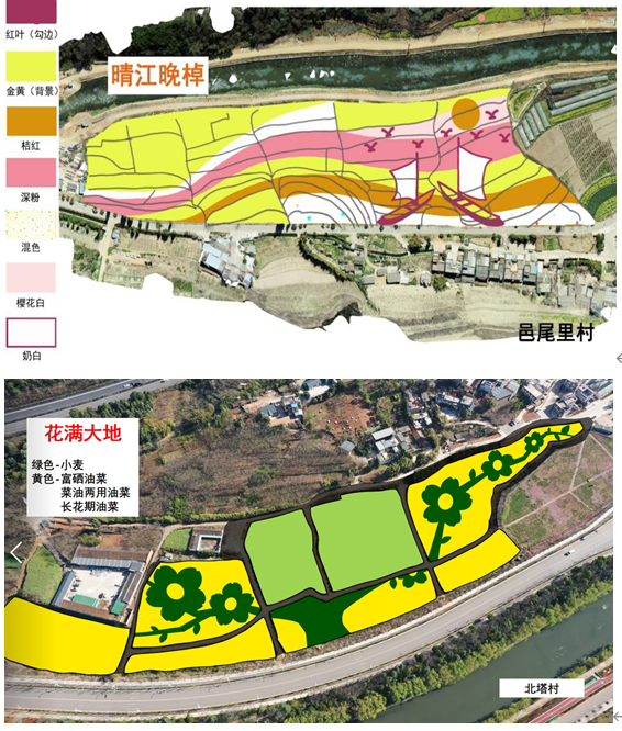 其中,甸中村油菜花种植约100亩,设计图案为“凤山夕照”;邑尾里村种植约60亩,设计图案为“晴江晚棹”;牧羊村约60亩,设计图案为“春圃桃霞”;白塔村约为60亩,其中20亩用于耕耘里蔬菜种植,其余采用小麦和油菜搭配图案,图案主题为“花满大地”
