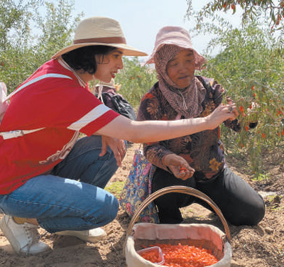 宝云(左)在闽宁镇与当地居民交流。受访者供图