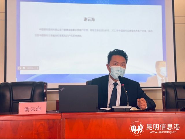 此次会议,还邀请到了中国银行昆明市西山支行普惠金融事业部客户经理谢云海,为企业解读知识产权质押融资政策体系,并就融资的惠企政策、昆明市开展的质押融资工作、专利权质押登记实务操作及融资风险补偿等业务开展培训。