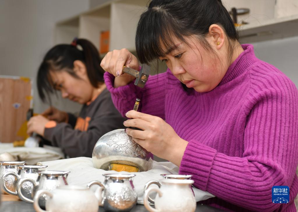 近年来,河北省沧县深入挖掘特色文化资源,积极推动传统制银技艺走规模化生产经营道路,形成集设计、生产、加工、销售于一体的特色银器产业,银器制品畅销海内外,有效带动当地群众增收。(新华社 记者牟宇 摄)