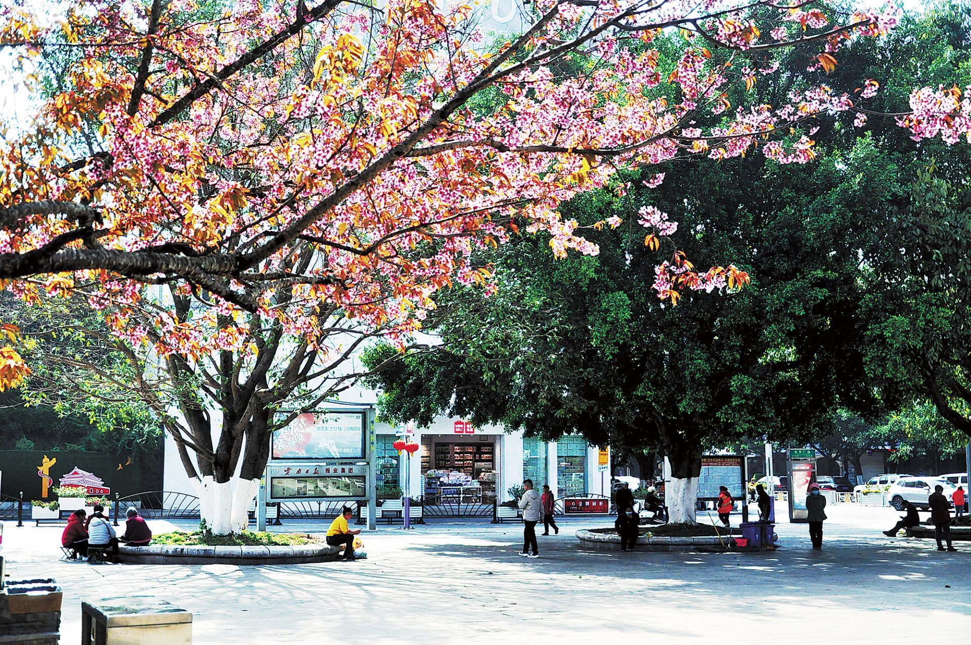 马关县县城安平广场的樱花,在春天到来之际,秀出了婀娜靓丽的身姿。成片的樱花树林,还有不断飘落的樱花花瓣,不禁让人心生向往。在这里,一眼望去,路边樱花粉红一片,像是一条粉红的彩带。樱花盛开,雀鸣蜂舞,粉红的花朵爬满枝头,团团簇簇如霞似锦,让赏花的人止不住地按下相机快门。
