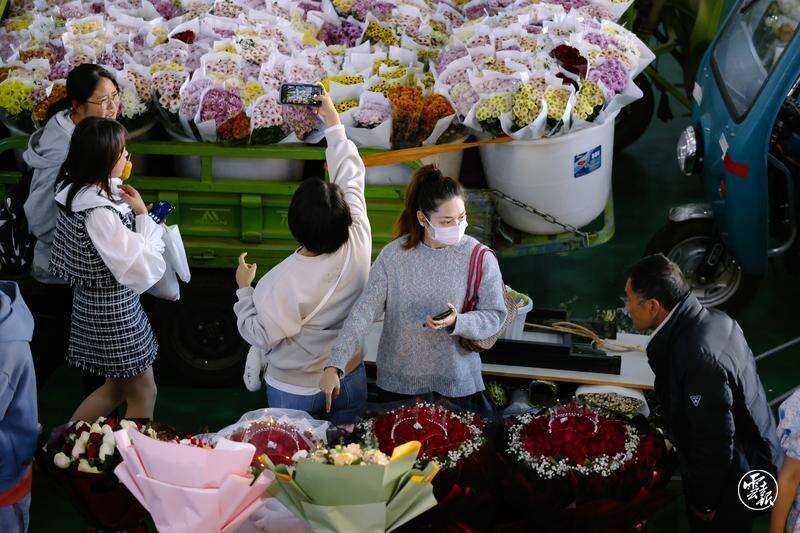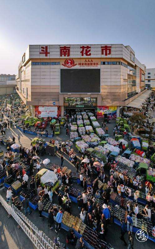 连日来,昆明花卉市场进入新春开局的交易高峰期。每天傍晚6时许的斗南花市便开始了新一轮的清场,花商们驾驶花车在市场入口处排队等待进场,市民游客穿梭其中选购鲜花,航拍视角下的斗南花市市场内外一片繁忙。