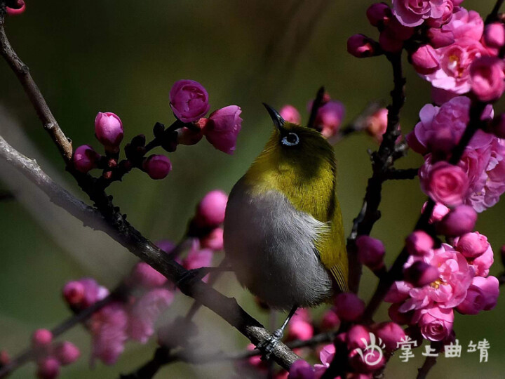 翠山红梅迎春怒放,引来美丽的绣眼鸟在花丛中吸食花蜜。披着一身金绿色羽毛的绣眼鸟,白色的眼圈围着黑亮的眼珠,眼睛极为有神。那白色的眼圈仿佛人工精心绣上一样,精致漂亮,故被人们称为绣眼鸟。身形娇小的绣眼鸟,长着细长的尖嘴,方便伸到花蕊中吸食花蜜。鸣叫着,绣眼鸟儿自由穿梭在梅花丛中,欢快地奔忙着。美丽的鸟儿与鲜艳的红梅花儿相映成画。