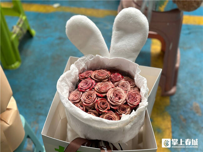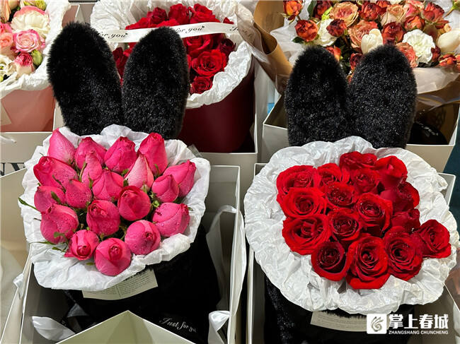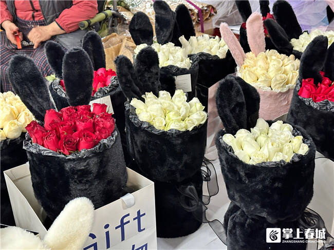 “新推出的兔子样式的造型花束,是我们店卖的最好的。”商户李先生介绍,由于今年是兔年,造型软萌的“兔子花束”很火爆,店里一束19朵玫瑰的“兔子花束”价格为148元。