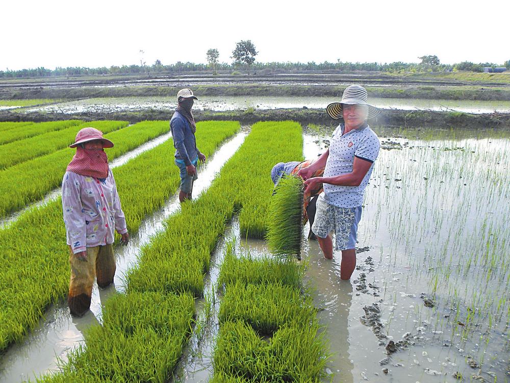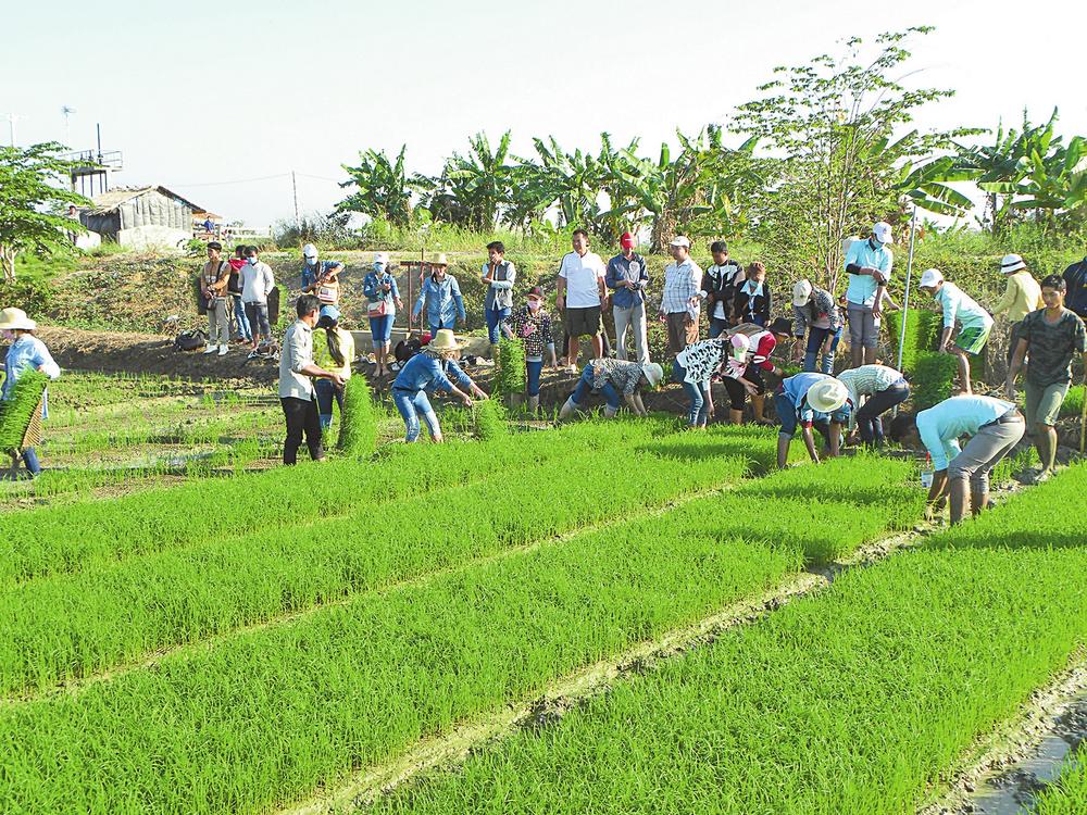 中国农业专家为柬埔寨农民进行水稻塑盘育秧、取秧技术培训。