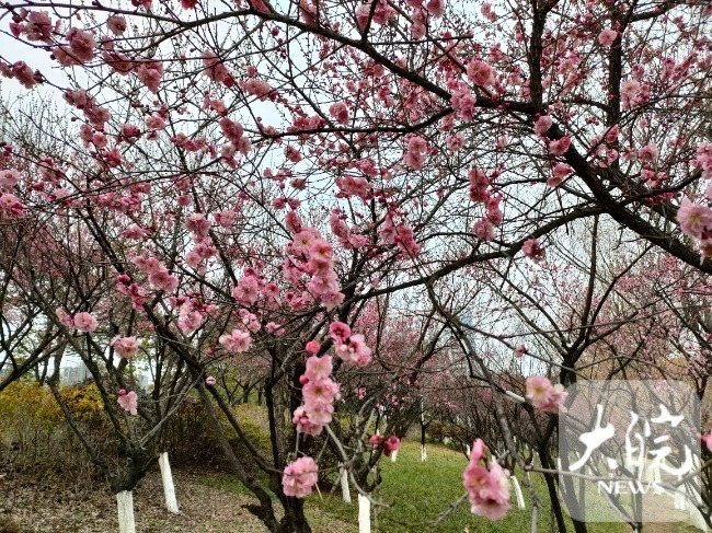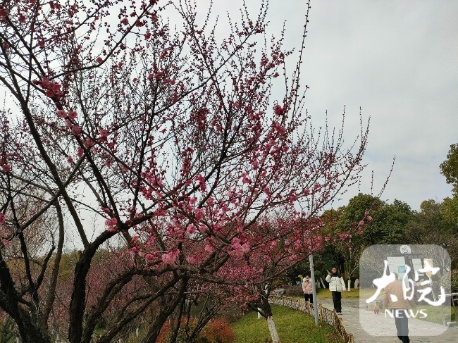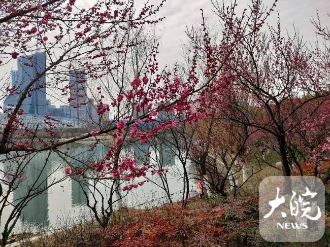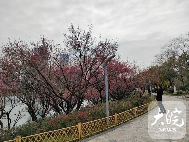 合肥天鹅湖北岸这片梅林,市民在梅花树边拍景、赏景,梅林内还有小鸟飞来飞去相映成趣。(大皖新闻 记者许佳)