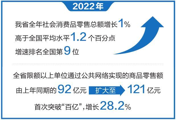 2022年,我省统筹疫情防控与消费促进工作,推动消费市场承压前行,全年社会消费品零售总额增长1%,高于全国平均水平1.2个百分点,增速排名全国第9位,是近3年来首次跻身全国前十。全省限额以上单位通过公共网络实现的商品零售额由上年同期的92亿元扩大至121亿元,首次突破“百亿”,增长28.2%。“新能源汽车下乡”成果显著,限额以上单位新能源汽车类商品零售额总量达91亿元,同比增长1.5倍。