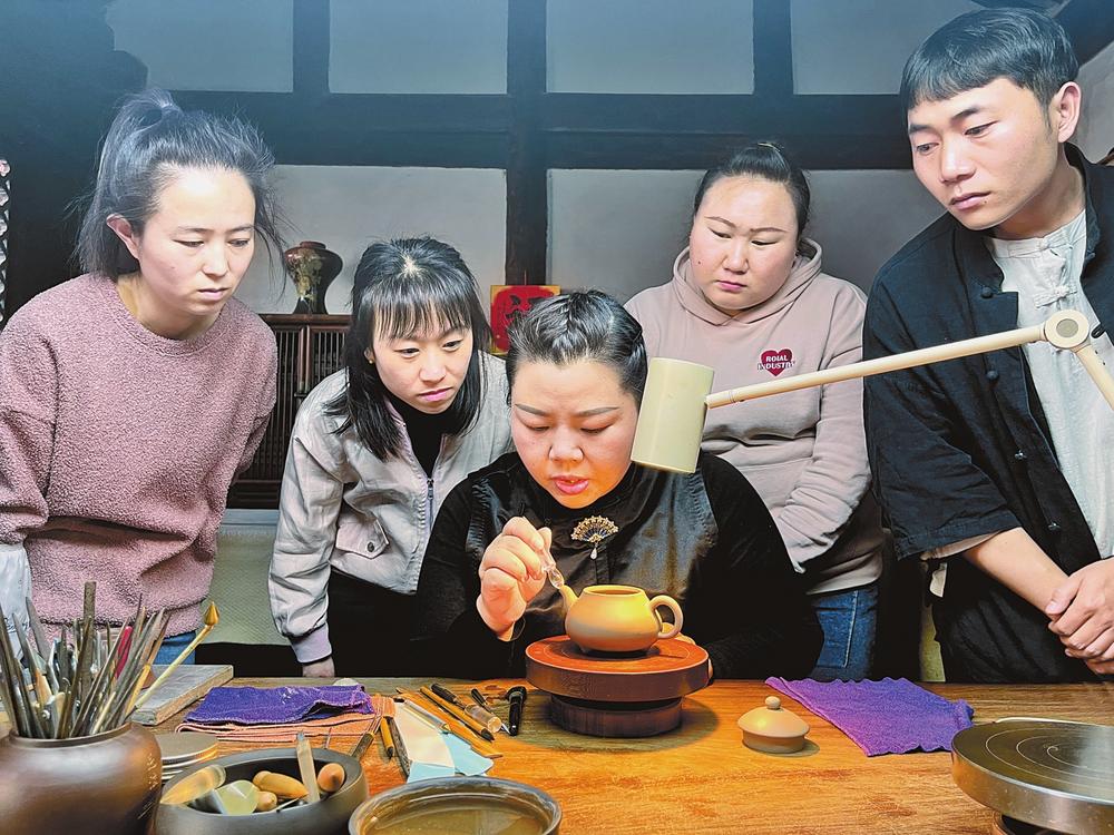 履职过程中,田静成立了紫陶技能传习中心,每年举办4期免费培训,培训学员300余人。为农村妇女进行紫陶制壶、填刻、打磨技能培训和授课,每年帮助不少于50名妇女实现居家灵活就业。启动开展“小小传承人孝亲课堂”项目,让孩子们从小接受传统文化的熏陶,也为非遗传承注入更多新鲜血液。
