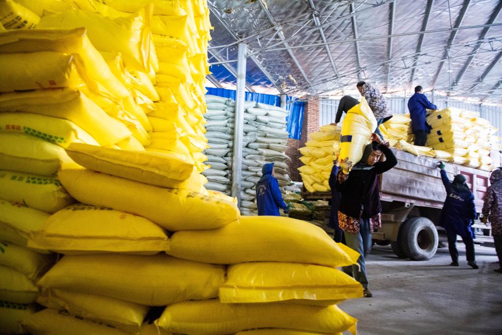 2月3日,在湖南省永州市祁阳市黎家坪镇供销惠农服务中心化肥储备库,工作人员正在搬运化肥。新华每日电讯记者陈思汗摄