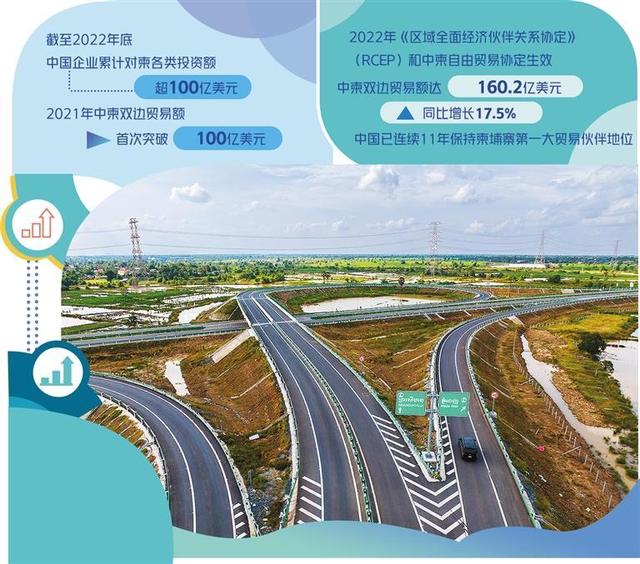 65年来,在两国领导人战略引领下,中柬关系不断深化,为两国人民带来了实实在在的利益。中国援建了柬埔寨第一条全线四车道国道、第一家水泥厂、第一座火电站、规模最大水电站。中柬共建“一带一路”重点项目不断取得新成果。柬埔寨特本克蒙省医院、考斯玛中柬友谊医院和柬埔寨国家体育场等援建项目也相继竣工交付。截至目前,中国已为柬援建或提供优惠贷款修建了8座跨河大桥、3000多公里公路、总灌溉面积约42万公顷的水利项目,铺设光缆总长度超2万公里,架设柬国家电网和农村输变电线路总长8000多公里。2022年10月连接金边和旅游胜地西哈努克港的金港高速公路通车试运营,助柬进入“高速公路时代”。作为中柬务实合作的样板,西哈努克港经济特区进驻企业已达175家,为当地创造约3万个就业岗位。暹粒新国际机场、西哈努克港至香港海底光缆、桔井湄公河大桥及接线公路等项目正在紧锣密鼓地建设中。
