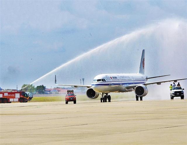2月7日,国航航班在柬埔寨首都金边国际机场接受水门礼。(新华社发)