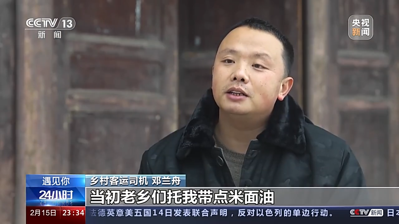 乡村客运司机 邓兰舟:我记得是2008年的时候,当初老乡们托我带点米、面、油,就是日常的生活用品。我当时带回来了,老乡们特别热情,在路上等着拿,然后就说小邓今天在我家里去做客。我觉得带东西是一件小事,举手之劳,就这样一直就坚持下来了。