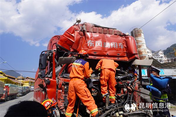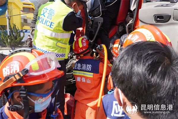 昆明信息港讯 记者劳学丽 通讯员艾宝亮 “你再坚持一下,我们马上救你出来”。事故现场,消防救援人员一边安抚着被困在驾驶室里的驾驶员,一边给他喂着葡萄糖水以保证其体力。2月16日上午10时43分,腾冲市消防救援大队指挥中心接支队指挥中心调派称,猴桥口岸附近一辆货车与一辆半挂车发生追尾,驾驶室严重变形,1名驾驶员被困。大队立即出动4车16名消防救援人员前往救援。