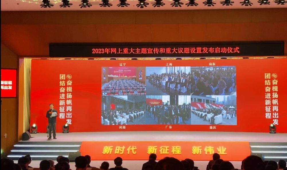 由中央网信办主办的“团结奋进新征程 奋楫扬帆再出发”2023年网上重大主题宣传和重大议题设置发布启动仪式17日采取云连线方式举行。仪式上发布了“核心领航 思想指引”“光辉岁月 壮丽图景”“天下一家 命运与共”“文明家园 数字中国”等主题的重点项目。