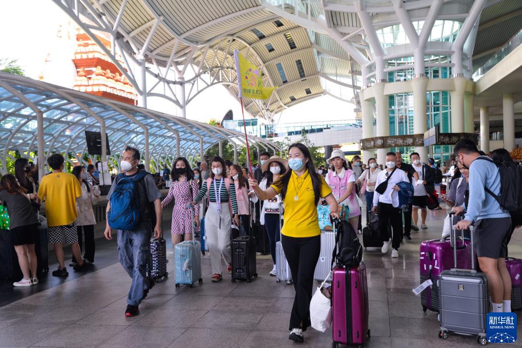 2月12日,在印度尼西亚巴厘岛伍拉莱国际机场,中国游客在领队引导下走出国际航班到达口。新华社记者 徐钦 摄