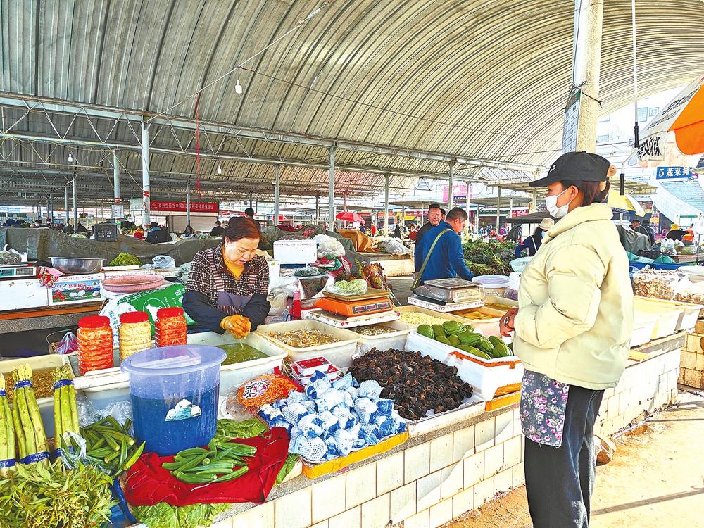 一早,记者在大理宾川金牛商业城农贸市场看到,灰条菜、苦麻菜、荠菜、水芹菜等刚上市的野菜已经被摆在醒目位置,市民争相挑选购买,都想尝尝“春天的味道”。
