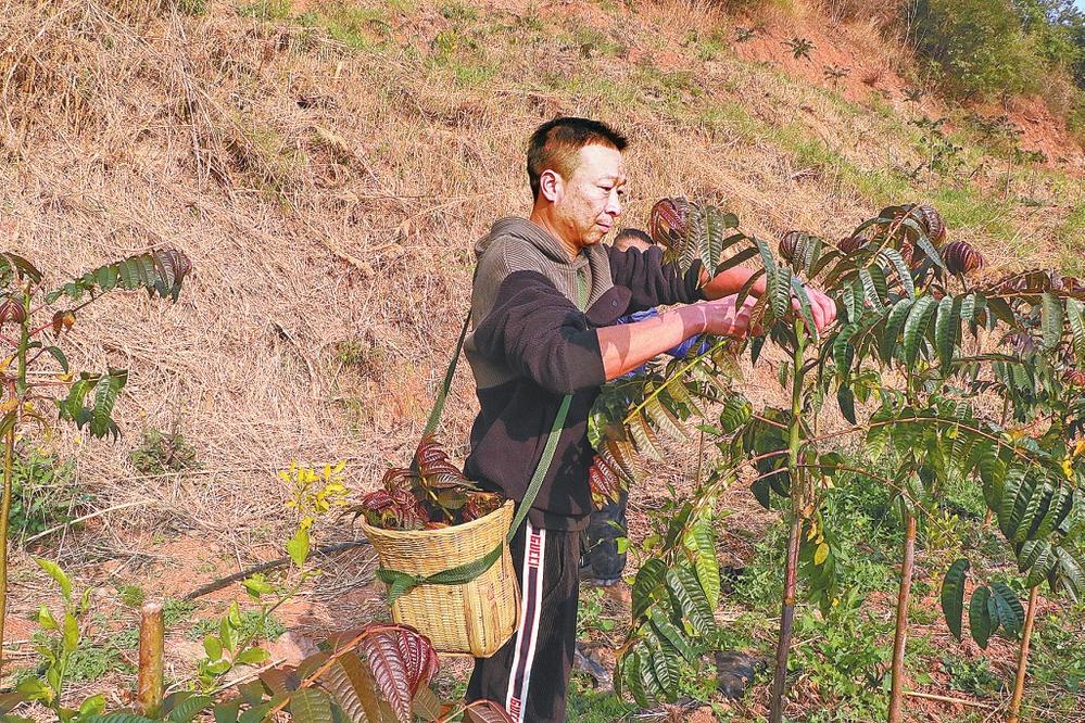 立春之后,华宁县宁州街道马鞍山社区大花水村椿香四溢,漫山遍野的香椿树吐出嫩芽,山地承租种植户杨小飞背着背篓,和合作伙伴一同穿梭于树间,忙着采摘第一茬椿芽。