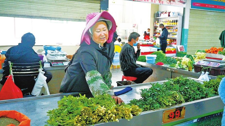 在城东片区的何家屯农贸市场,蔬菜区摊位上正售卖着本地的绿肥尖和荠菜。一个摊主表示,当前是绿肥尖最嫩、口感最好的时候。