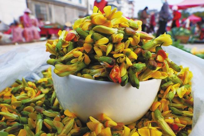 在保山市施甸县城的农贸市场,白露花、辛夷花、金雀花、桑花、金芭蕉花,从四面八方聚拢而来,散发着阵阵清香,市民纷纷驻足咨询、购买。