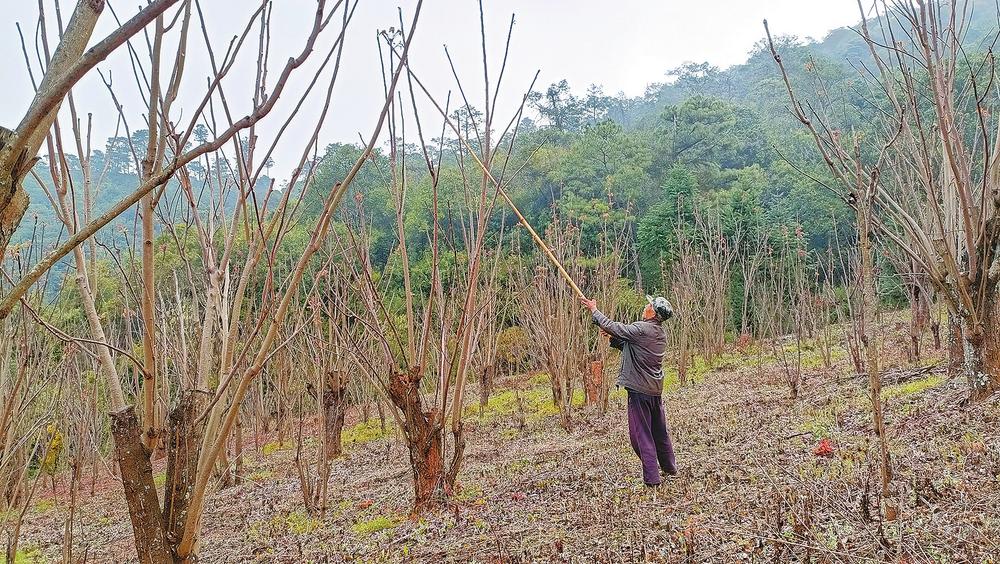 2月15日,跨喜村村民普长和与妻子起了个大早,他们带着工具,走了20多分钟的山路,来到香椿地采摘香椿芽。