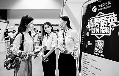 2022年7月30日,在呼和浩特市高校毕业生系列招聘活动现场,工作人员向求职者介绍工作岗位。丁根厚摄/光明图片